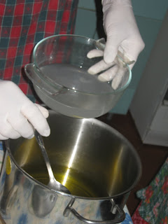 Con il cucchiaio di acciaio versare molto piano e a poco a poco la soda caustica dal barattolo di plastica dentro all'acqua (NON METTETE MAI L'ACQUA NELLA SODA). Sentirete che la temperatura salirà molto in fretta percio' fate attenzione! Mescolate piano la soda dentro all'acqua. Lasciatela raffredare.