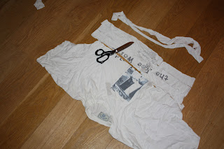 Tagliate delle strisce dalla t-shirt, cucitene tre insieme all'estremità, fate una lunga treccia che potrete raddoppiare oppure fatene 2 o 3 per poi unirle alle estremità e volendo anche tra di loro.