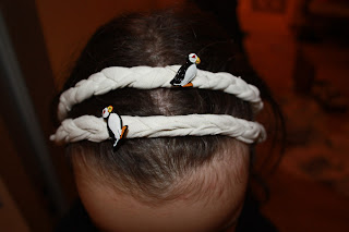 palle di neve, le mie figlie hanno regalato una fascia per capelli alle amiche, sono ideali sia per piccole e per grandi. Le abbiamo fatte con una vecchia t-shirt, ago e filo e delle decorazioni dalla scatola del cucito!