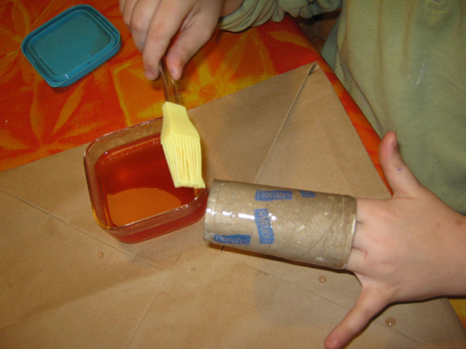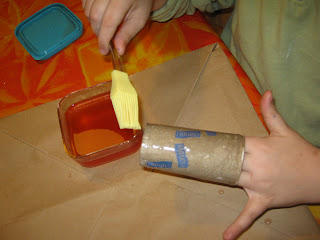 With the paint brush paint the toilet paper roll or pine cone with the jam or the honey.