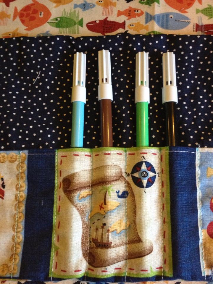 prendere 2 pezzi di stoffa da 20x70 e uno più piccolo da 10x70. Prendere una riga e segnare dei punti su una delle due stoffe da 20x70 a due cm di distanza uno dall'altro. Sovrapporre la stoffa da 10x70 e cucire lungo i punti segnati in modo da avere gli incavi in cui riporre i pennarelli.